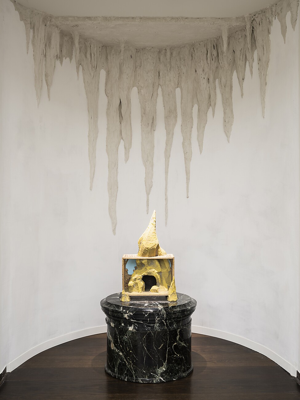 Ausstellungsort ist – wie damals – der Kuppelsaal im Obergeschoss des 1919 eingeweihten Erweiterungsbaus. Er diente in den 1970er Jahren als zentraler »Denk-Raum« sowie als kuratorisches Experimentierfeld. Die gegenwärtige Ausstellungsarchitektur gestaltete Marten Schech in Form einer skulpturalen Intervention: Binnacle (Round Lodge with Three Corners). Der Künstler bezieht sich auf den kreisförmigen Grundriss und erweitert die Architektur durch An-, Ein- und Umbauten. Das Ensemble changiert zwischen Massivbau und Kulisse; Kalkfarbe und Oberflächenstruktur greifen die Außenmauern barocker und klassizistischer Bauten auf. Im Eingangsbereich findet sich dieser Putz in einem Innenraum wieder – als Teil eines Displays, das sich Träumen um 1800 widmet. Die Textur entfaltet eine unheimliche Materialität und wirkt wie der verdrängte ästhetische Rest eines Ancien Régime. Das Nebeneinander von perfekten und ruinösen Oberflächen kommentiert die Funktion des Museums als eine Institution, die Kunst für die Ewigkeit bewahren will. Innen und Außen, Skulptur und Interieur oder Anfang und Ende überkreuzen sich fortwährend und werden in der gesamten Ausstellung ineinander verwirbelt.