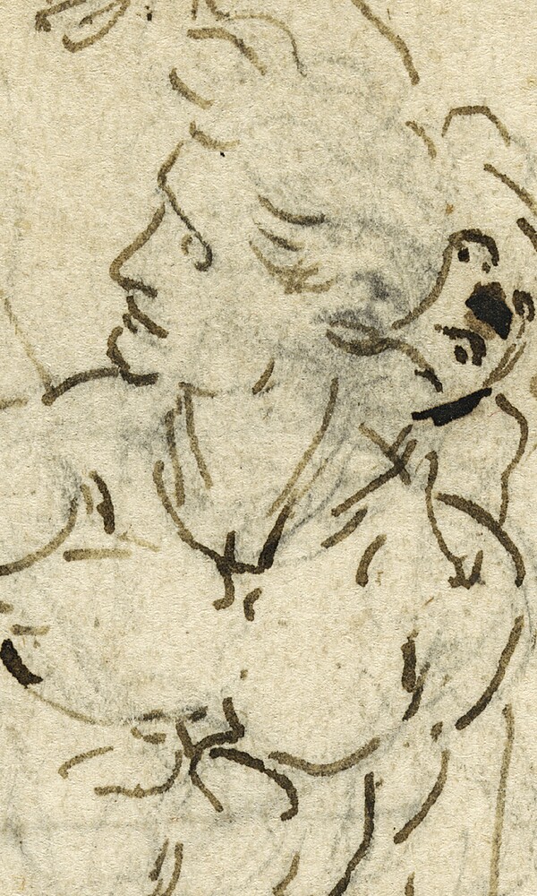 Im Mittelpunkt der Präsentation stehen die vier Leonardo-Zeichnungen, die zwischen ca. 1475 und 1505 entstanden sind. An ihnen lassen sich die grundlegenden Elemente von Leonardos künstlerischen Absichten als Zeichner ausmachen und die verschiedenen Facetten seiner kreativen Persönlichkeit veranschaulichen. So zeigen die Studie zu einer Anbetung der Hirten (um 1480) und der Hl. Sebastian (um 1478/1483) Leonardos virtuose, suchende Zeichenweise und seine Experimentierfreude, die zu erstaunlich freien Linienzügen führt. Die durch das purpurviolett grundierte Papier besonders reizvolle Anbetung der Hirten verdeutlicht seine Fähigkeit, mit wenigen Strichen ausdrucksstarke Gestalten und eine spannungsvolle Szenerie zu entwickeln. Der Hl. Sebastian ist das Studium einer komplizierten Körperbewegung, die möglicherweise als Vorstudie für ein privates Andachts- oder Altarbild diente. Das Blatt mit Aristoteles und Phyllis (um 1475) entstammt der Frühzeit Leonardos und bietet eine in der zweiten Hälfte des 15. Jahrhunderts populäre Szene der »Macht der Frauen über die Männer«. Dargestellt ist der Moment, in dem sich der griechische Philosoph Aristoteles (384–324 v. Chr.) am Boden kriechend von seiner Geliebten Phyllis demütigen lässt. Der Kopf eines alten Mannes oder einer alten Frau im Profil (um 1495/1505) steht beispielhaft für Leonardos bis dahin einzigartige systematische Studien der menschlichen Physiognomie. Dabei ging es ihm nicht nur um die Darstellung von Schönheit und Harmonie, sondern auch um das vermeintlich Hässliche und Deformierte.