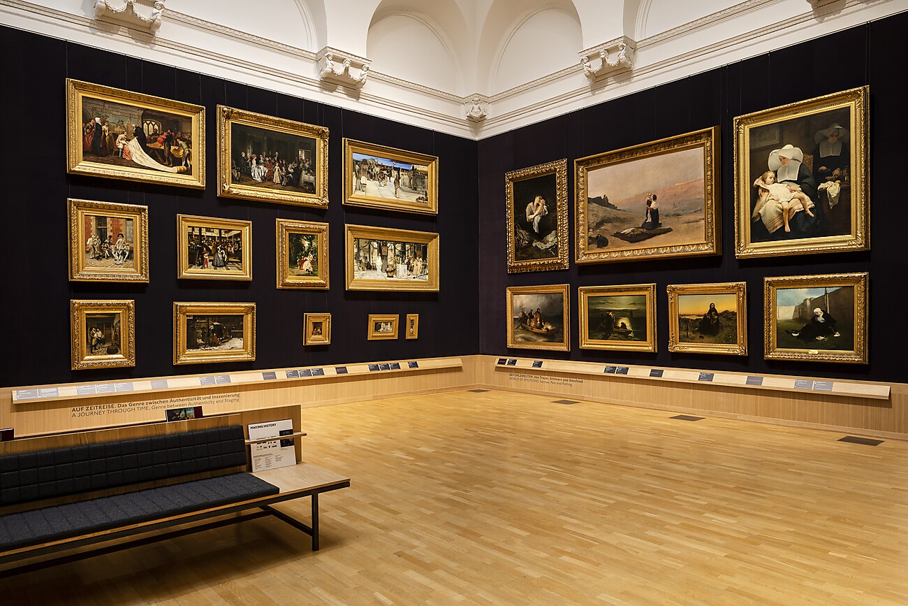 Die starke Präsenz der Historienmalerei verdeutlicht den Aufschwung, den gerade diese Gattung im Laufe des 19. Jahrhunderts erlebte. Ihren Grund hat dies in der politisch angespannten Situation in Europa mit den steten Wechseln von revolutionären und restaurativen Tendenzen. Insbesondere drei Gemälde von Paul Delaroche (1797–1856), einem der bedeutendsten Historienmaler seiner Zeit, verdeutlichen die Neuausrichtung des Geschichtsbildes: Seine Herrschergestalten zeigt er als nahbare und nachdenkliche Individuen. Von den akribisch ausgearbeiteten Genreszenen geht ebenfalls eine starke Suggestionskraft aus. Sie nehmen die Betrachter*innen mit auf eine Zeitreise in die römische Antike, wie in den Werken von Lawrence Alma-Tadema (1836–1891), oder ins französische Rokoko bei Ernest Meissonier (1815–1891). Die Geltung der Antike als Form- und Stoffreservoir für die Kunst hatte das gesamte 19. Jahrhundert über Bestand. Dominiert wird dieser Themenkomplex von Anselm Feuerbachs (1829–1880) großformatigem Gemälde Das Urteil des Paris (1870). Die auffällige Präsenz von Arbeiten, die Gefühle zum Thema haben, steht ebenfalls in Verbindung mit dem damaligen Wunsch nach einer emotionalen Involvierung, beispielhaft dafür sind Die barmherzigen Schwestern (1859) von Henriette Browne (1829–1901). Zugleich reagierte die Genremalerei mittels aktueller Themen, wie etwa Karl Schlesinger (1825–1893) mit dem Gemälde Auswanderer setzen über (1851), auf die neue soziale Realität. Bedingt durch Kriege, Hungersnöte und Arbeitslosigkeit sahen sich um die Jahrhundertmitte Hunderttausende Menschen veranlasst, Europa zu verlassen. Mit dem heutigen Blick auf diese Malerei werden Parallelen zu den gegenwärtig medial vermittelten Bildern von Flüchtlingsbooten virulent. Eine Gruppe vornehmlich englischer Künstler richtete ihren Blick oftmals auf den Nahen Osten. Getragen von dem Wunsch, die für westliche Augen fremde Welt möglichst schillernd vorzustellen, ist die »Orientmalerei« zugleich Zeugnis einer eurozentrischen Sicht auf die arabisch-islamische Kultur. Diese Werke gehen maßgeblich auf die bedeutenden Stiftungen von Gustav Christian Schwabe (1886) und Freiherr Johann Heinrich von Schröder (1910) zurück, dank derer die Hamburger Kunsthalle noch heute über eine der größten Sammlungen an englischer Malerei des 19. Jahrhunderts auf dem europäischen Kontinent verfügt. Den Abschluss bilden die imposanten Landschaftsdarstellungen von Oswald Achenbach (1827–1905) und seinen Zeitgenossen, die mit der Etablierung des Impressionismus um die Jahrhundertwende bald nicht mehr gefragt waren.