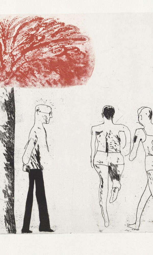 In den Radierungen für Fourteen Poems by C. P. Cavafy aus den Jahren 1966/67 folgt Hockney den Spuren des griechischen Schriftstellers Konstantinos Kavafis (1863-1933). In seinen erotischen Gedichten schildert Kavafis die eigenen homosexuellen Phantasien und Träume. Hockney entdeckte die Verse von Kavafis bereits während seiner Studienzeit in London. 1966 reiste er nach Beirut, um erste Zeichnungen für die Drucke zu schaffen. Während in A Rake’s Progress die bildliche Geschichte durch das malerische Aquatinta in Schwarz und Rot inszeniert wird, sind die Radierungen zu Kavafis Gedichten durch die sparsame Linienführung gekennzeichnet, die auch für die in der Ausstellung gezeigten Zeichnungen charakteristisch ist.